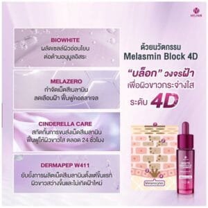 Facial care ampoule, concentrated formula, nourishes and strengthens the skin. Inhibit the production of melanin pigment with the innovation Melasmin Block 4D, “blocking” the blemish cycle for skin to look radiant at the 4D level, helping to promote efficiency in the next step of nourishment. Locks in moisture and deeply revitalizes blemish-prone skin. There are no dangerous substances. Sensitive skin can use it.